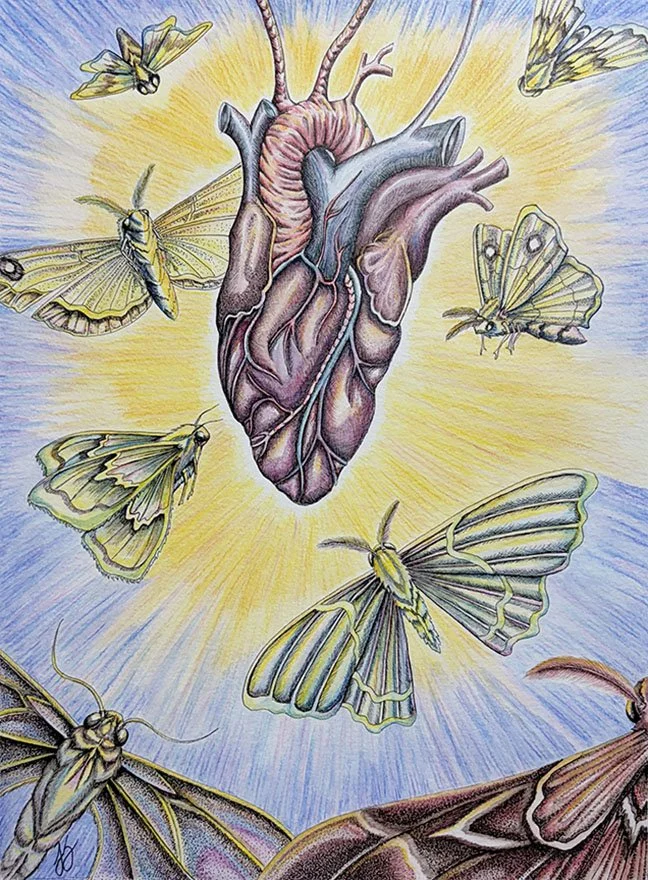 "Moth to a Flame", 9"x 12" (framed) 275.00 There's a fine line between a flame that lights our path and one that consumes us. This is the duality of desire: it can elevate or destroy. We don't always know which until we're too close.